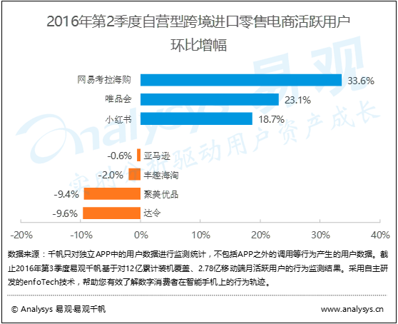 自營型跨境進(jìn)口零售電商中,承載其業(yè)務(wù)APP的活躍用戶表現(xiàn)出了較明顯的差距:網(wǎng)易考拉海購以33.6%的增長(zhǎng)態(tài)勢(shì)處于第一,其在郵箱、新聞、音樂、游戲等領(lǐng)域的用戶協(xié)同效應(yīng)逐漸被釋放出來。唯品會(huì)與小紅書差距不大,分列以23.1%和18.7%居于第二、第三位,其余的主要廠商,第2季度的活躍用戶環(huán)比都為負(fù)增長(zhǎng)。