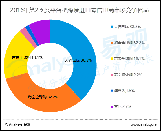 在平臺(tái)型跨境進(jìn)口零售電商中,阿里巴巴旗下的天貓國際、淘寶全球購居于領(lǐng)先地位,其份額分別達(dá)到了38.3%和32.2%,而京東全球購緊隨其后,擁有18.1%的份額;以上三個(gè)平臺(tái)占據(jù)了平臺(tái)型跨境進(jìn)口零售市場(chǎng)中近九成的份額,遙遙領(lǐng)先于其他廠商,在市場(chǎng)中有絕對(duì)的影響力。另外,蘇寧海外購、洋碼頭分別以2.2%和1.5%的份額排在第四、第五位,其還有進(jìn)一步擴(kuò)大市場(chǎng)份額的空間。