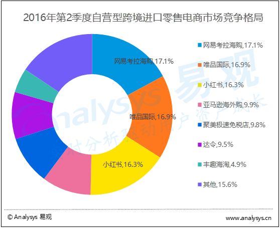 在自營型跨境進(jìn)口零售電商中,相對(duì)平臺(tái)型而言較為分散,各廠商的競(jìng)爭(zhēng)更為激烈。網(wǎng)易考拉海購以17.1%的份額排在第一位,唯品國際與小紅書分別以16.9%和16.3%的份額排在第二、第三位。市場(chǎng)中前三位占據(jù)剛好過半的份額,處于第一梯隊(duì),相對(duì)于其他廠商而言,有較明顯的領(lǐng)先優(yōu)勢(shì)。亞馬遜海外購、聚美極速免稅店、達(dá)令的市場(chǎng)份額較為接近,處于第二梯隊(duì)。