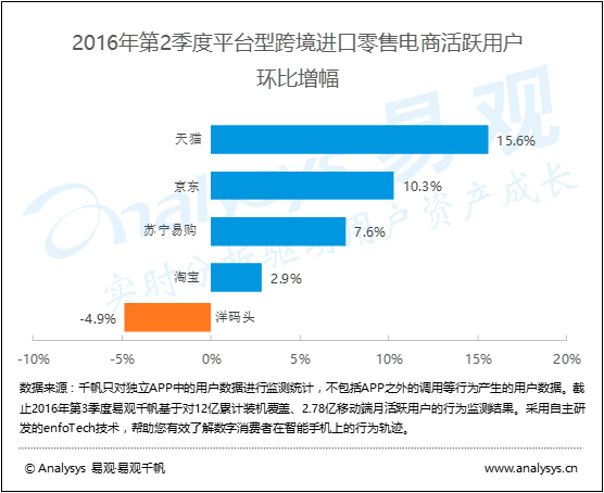 平臺(tái)型跨境進(jìn)口零售電商中,承載其業(yè)務(wù)APP的活躍用戶表現(xiàn)出了一定的差異:天貓和京東相對(duì)較高,分別為15.6%與10.3%;淘寶的活躍用戶增長(zhǎng)較低,只有2.9%;蘇寧易購介于二者之間,為7.6%;而洋碼頭則出現(xiàn)了負(fù)增長(zhǎng),為-4.9%。這表現(xiàn)出了用戶的選擇偏好有朝B2C模式的平臺(tái)型電商集中的趨勢(shì)。