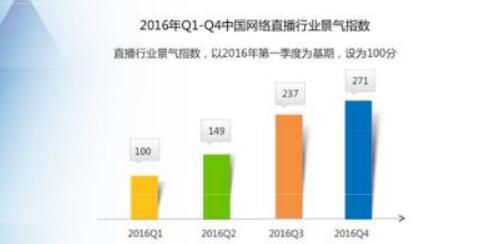 2016年我國的網(wǎng)絡直播行業(yè)實現(xiàn)了全年持續(xù)增長,以一季度100為基數(shù),第四季度中國網(wǎng)絡直播行業(yè)景氣指數(shù)為271,環(huán)比增長14.34%,在經(jīng)歷了前三季度的爆發(fā)式增長之后,中國網(wǎng)絡直播行業(yè)步入平穩(wěn)增長期。