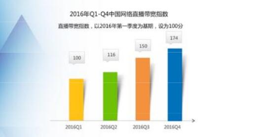 具體來看,延續(xù)前三季度網(wǎng)絡直播帶寬指數(shù)的持續(xù)增勢,2016年第四季度中國網(wǎng)絡直播帶寬指數(shù)為174,環(huán)比增長16%,與二季度的環(huán)比增速持平。