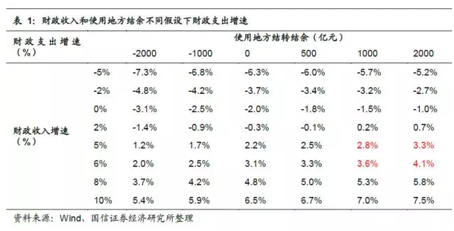 根據(jù)前述分析,決定全年最終財(cái)政支出數(shù)量的變量有三個(gè):財(cái)政收入、預(yù)算赤字、中央和地方結(jié)余的使用。這里我們對不同情況下2017年的財(cái)政支出增速進(jìn)行展望。我們假設(shè)2017年名義GDP增速在10%,假設(shè)預(yù)算赤字占名義GDP的比重為3%(2016年按已經(jīng)公布的名義GDP和計(jì)算為2.9%),則計(jì)算出2017年預(yù)算財(cái)政赤字為24500億。