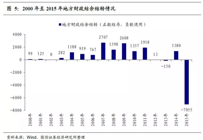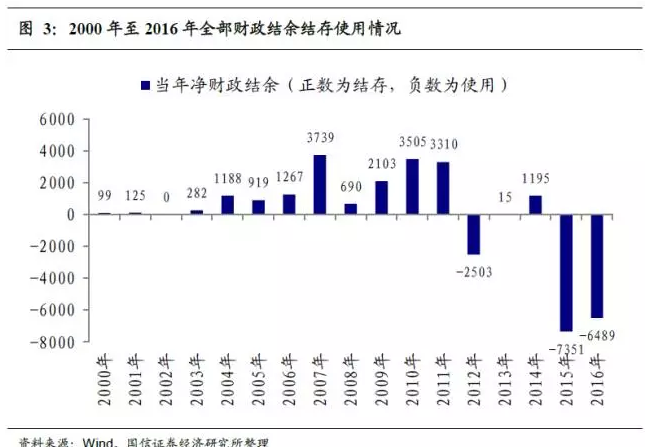 相反,“實(shí)際赤字”或者說“財(cái)政赤字-財(cái)政結(jié)余”占GDP的比重卻能夠較好地反映財(cái)政政策的積極程度。對財(cái)政結(jié)轉(zhuǎn)結(jié)余進(jìn)行調(diào)整后,我們可以清晰的發(fā)現(xiàn):由于大量使用財(cái)政結(jié)余(圖3),2015年和2016年連續(xù)兩年的財(cái)政刺激力度都要遠(yuǎn)超2009年的水平,正是這個(gè)原因才使得我們的基建投資增速在已經(jīng)很高的基數(shù)上還連續(xù)兩年保持了近20%的增速。