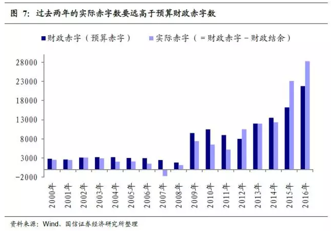 財(cái)政結(jié)余在2015年和2016年連續(xù)兩年被大量使用,這使得過去兩年的實(shí)際赤字?jǐn)?shù)要遠(yuǎn)高于預(yù)算財(cái)政赤字?jǐn)?shù)(圖7)。以2015年為例,預(yù)算財(cái)政赤字為1.62萬億,而實(shí)際赤字高達(dá)2.31萬億,意味著通過使用財(cái)政結(jié)余是的赤字提高了近43%。