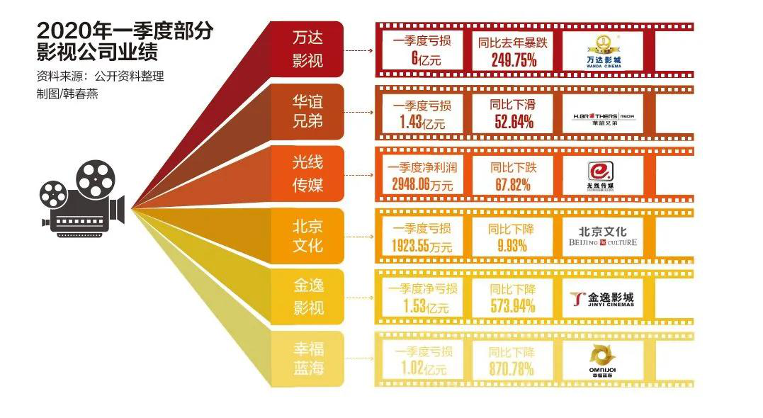 影院停業(yè)、電影撤檔的背后,上市影視公司業(yè)績(jī)一片慘淡。萬(wàn)達(dá)電影一季度營(yíng)收同比下跌70.12%,虧損近6億元,同比去年暴跌249.75%。中國(guó)電影一季度營(yíng)收同比下降88.39%,虧損2.27億元,同比去年暴跌163.95%。此外,華誼兄弟、橫店影視、金逸影視等一季度均處于虧損狀態(tài)。