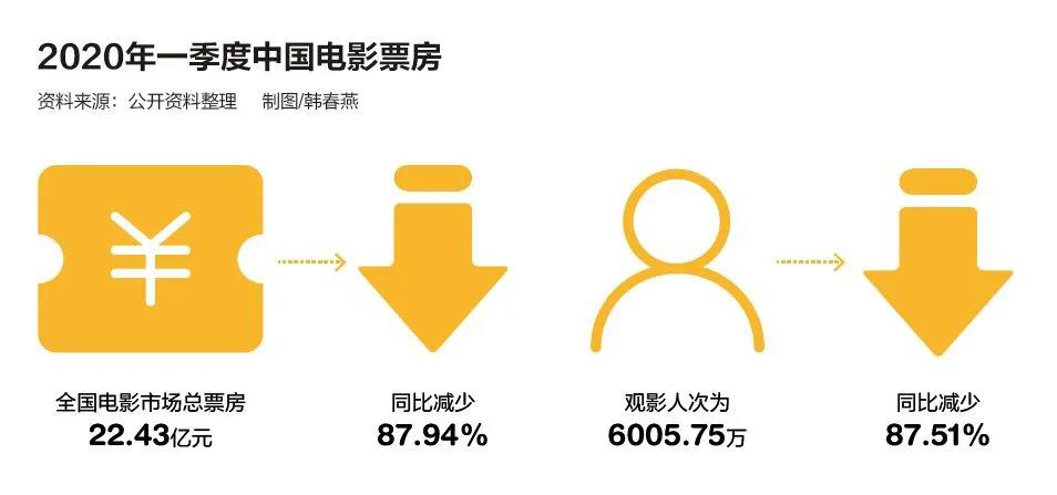藝恩數(shù)據(jù)顯示,2020年一季度,全國(guó)電影市場(chǎng)總票房22.43億元,同比減少87.94%;觀影人次為6005.75萬(wàn),同比減少87.51%。電影票房和觀影人次的暴跌,使得包括影視制作公司、宣傳發(fā)行公司、院線公司在內(nèi)的整個(gè)電影行業(yè)都不景氣。